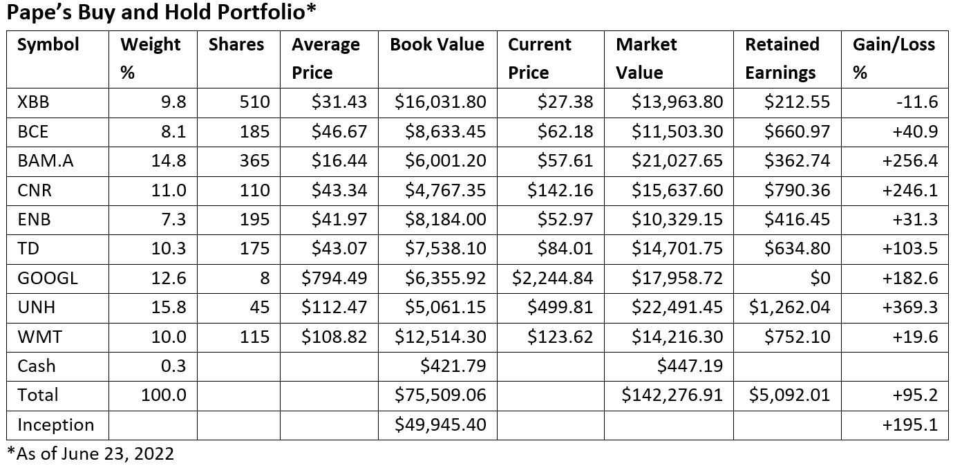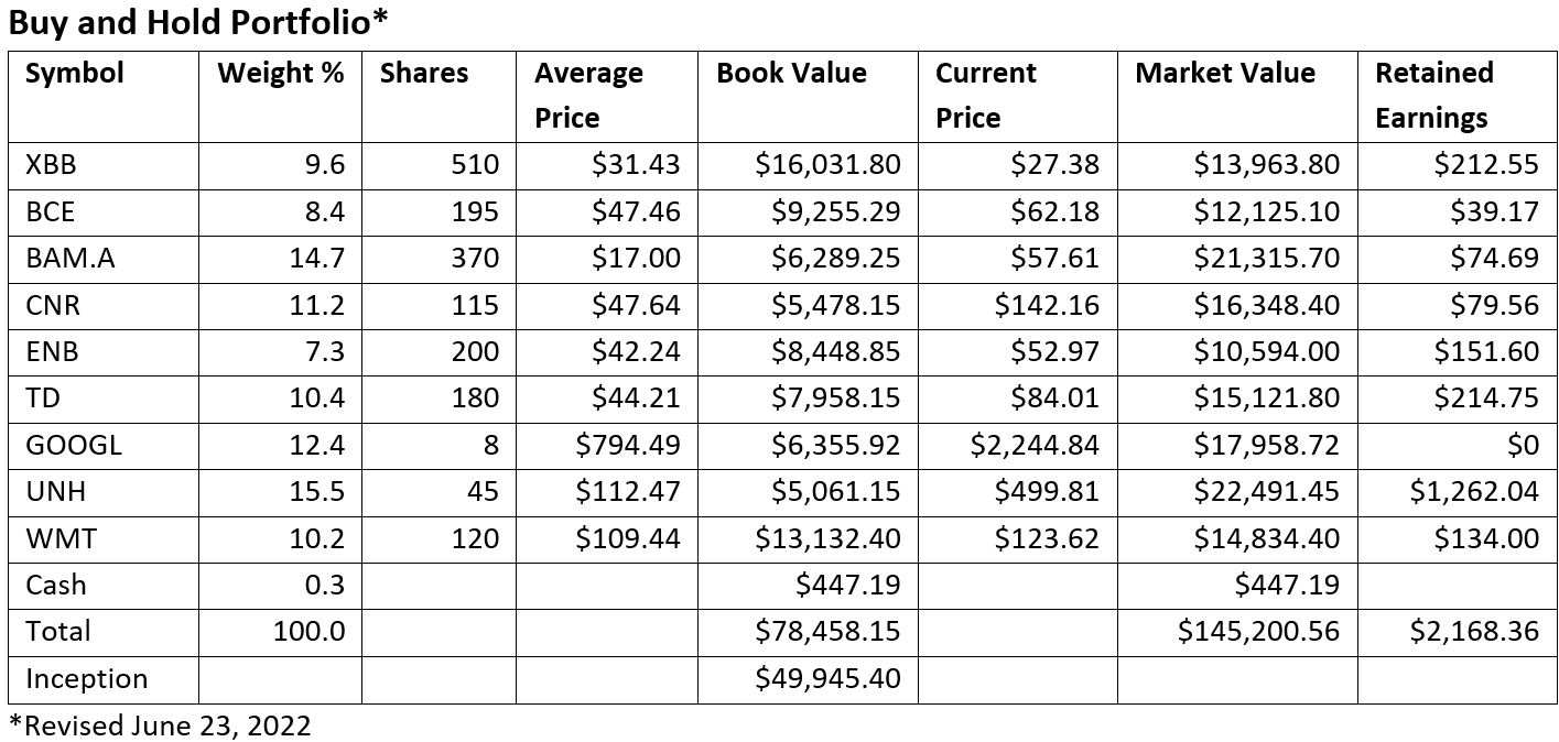 Here is the status of the portfolio as of June 23. For consistency, the Canadian and U.S. dollars are shown at par. Trading commissions are not factored in, although in a buy and hold portfolio they are not significant in any event.