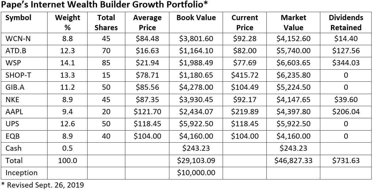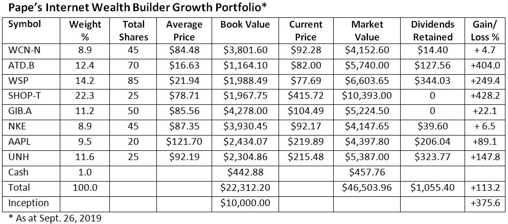 Here is how the portfolio stood at the close on Sept. 26. Commissions are not considered. The U.S. and Canadian dollars are treated as being at par, but obviously, gains (or losses) on the American securities are increased due to the significant exchange rate differential.