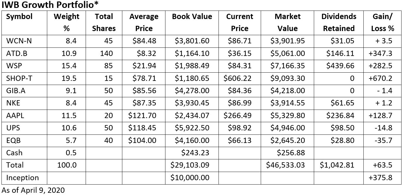 Here is how the portfolio stood at midday on April 9. Commissions are not considered. The U.S. and Canadian dollars are treated as being at par but obviously gains (or losses) on the American securities are increased due to the significant exchange rate differential.