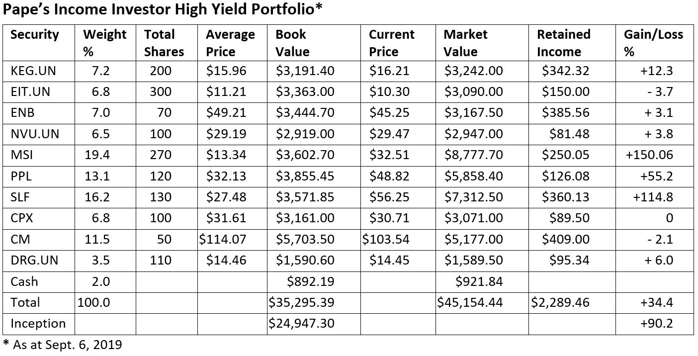 In the case of Morneau Shepell, for example, was have a capital gain based on the average purchase price of 144%. But since the company has not raised its dividend in years, the yield is down to 2.4%. Since the stock now carries a weighting of 19.4%, it is largely responsible for dragging our average yield below the target 5%.