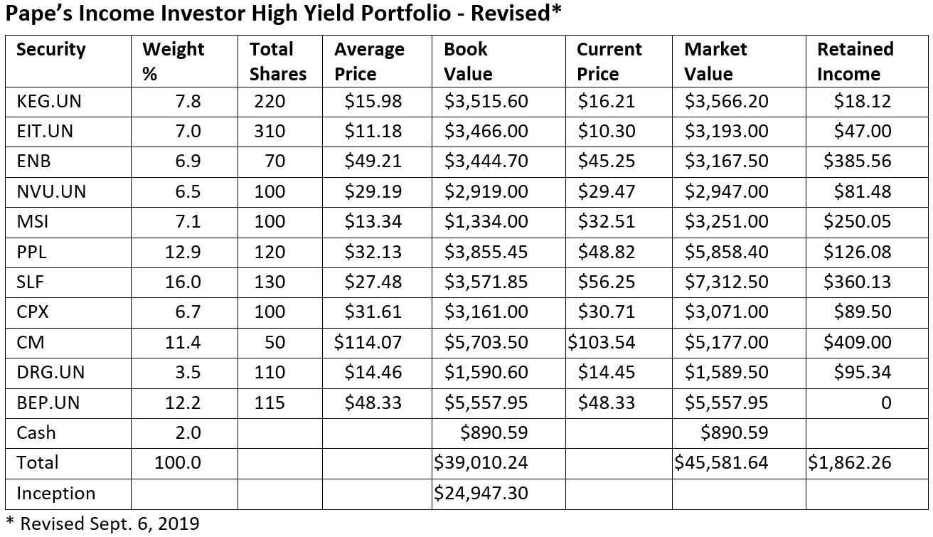 Changes: We are faced with the same dilemma with Morneau Shepell as we were previously with Premium Brands. Both stocks produced impressive capital gains for this portfolio. But in both cases, the large increase in the share price pushed down the dividend yield to unacceptably low levels for a portfolio designed to generate above-average cash flow.