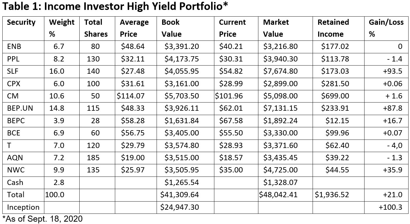 I created my High-Yield Portfolio in March 2012 for income investors looking for above-average cash flow and who could handle a higher level of risk. It invests entirely in stocks, so it is best suited for non-registered accounts where any capital losses can be deducted from taxable capital gains. Also, a high percentage of the payments will receive favourable tax treatment as eligible dividends or return of capital.