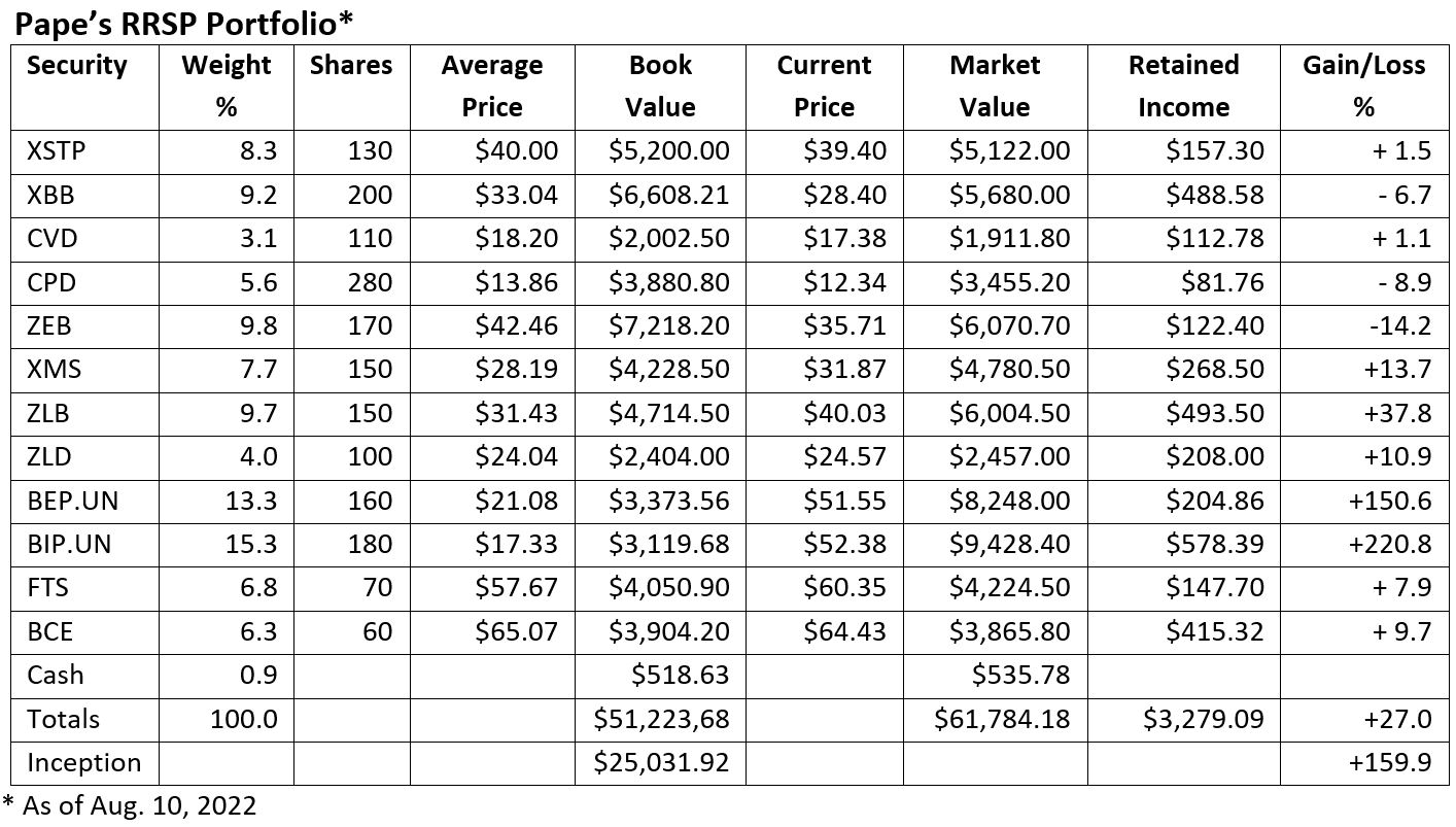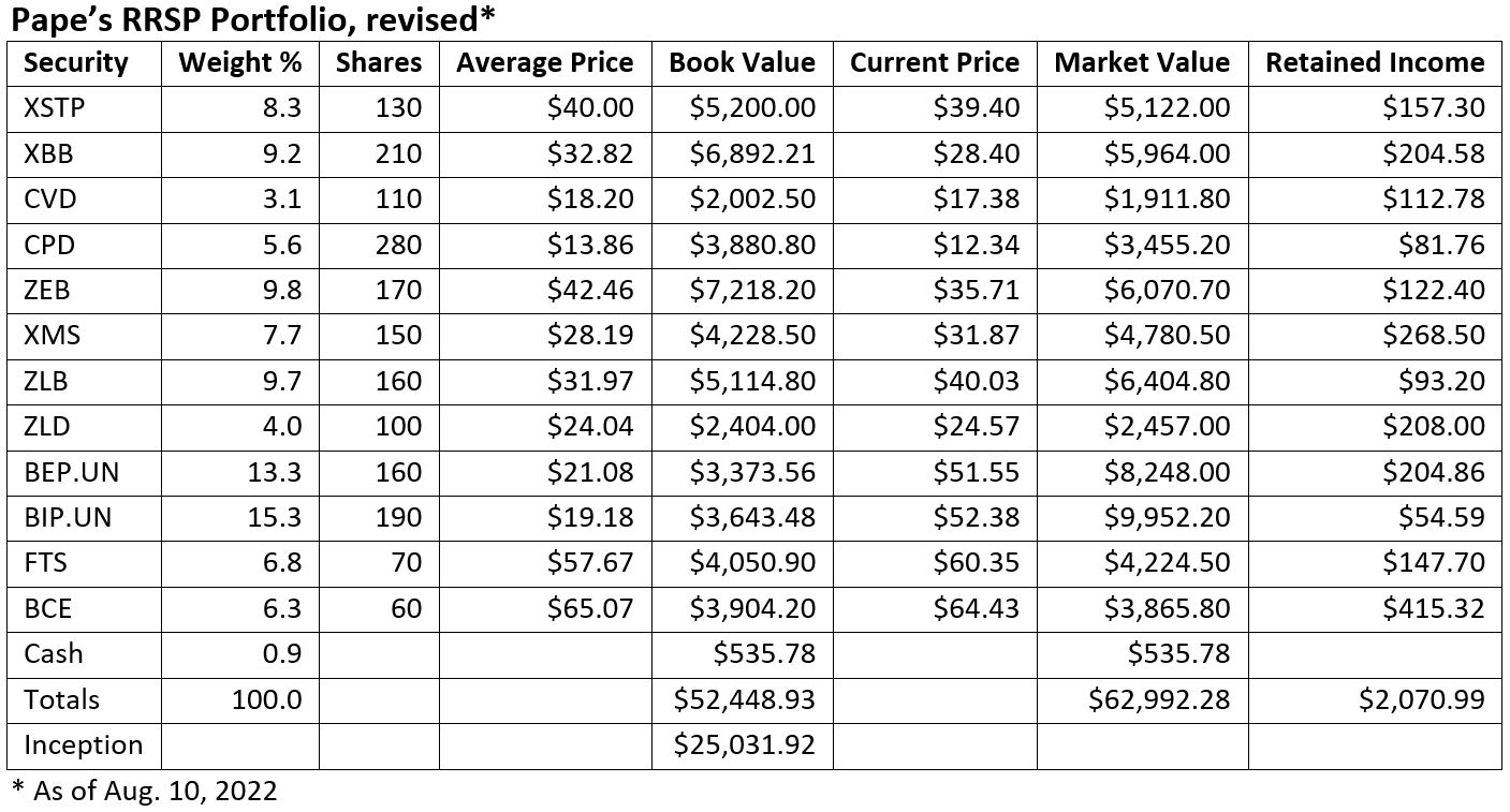 The following table shows how the RRSP Portfolio stood as of Aug. 10. Commissions have not been factored in and Canadian and U.S. currencies are treated at par for ease of tracking.