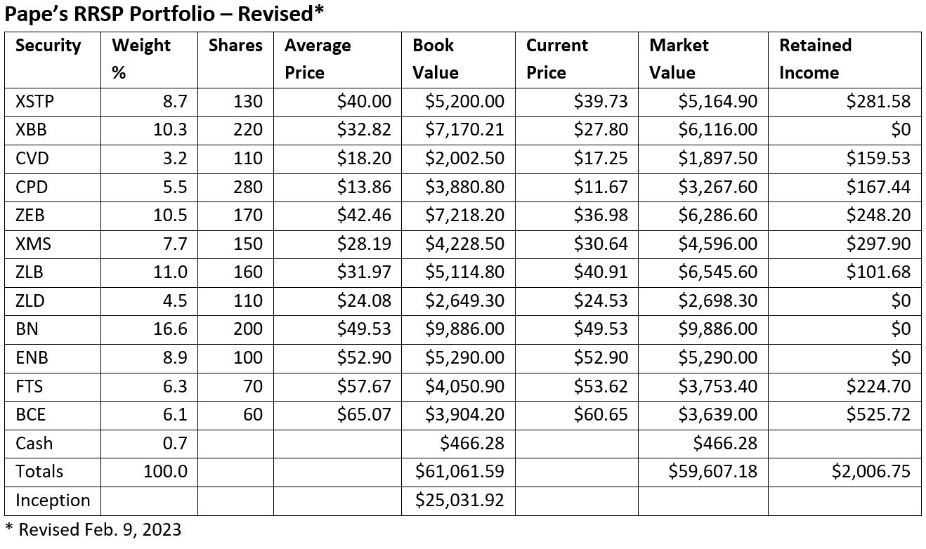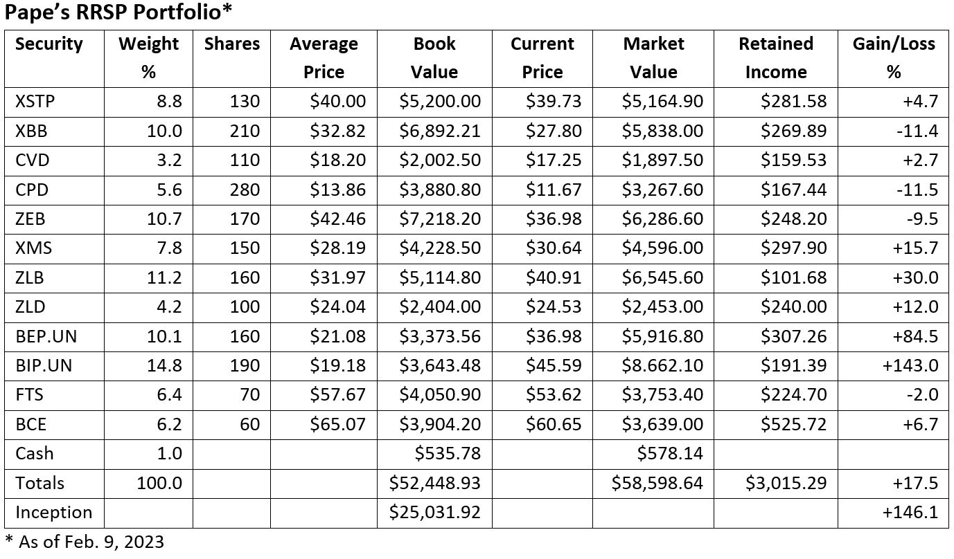 Here is how the RRSP Portfolio stood as of Feb. 9. Commissions have not been factored in. Canadian and U.S. currencies are treated at par but only come into play in the distributions from the two Brookfield funds.