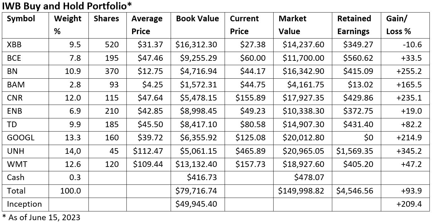 Here is the status of the portfolio as of June 15. The Canadian and U.S. dollars are shown at par, but obviously the U.S. holdings are doing better thanks to the strength of the greenback. Trading commissions are not factored in, although in a buy and hold portfolio they are not significant in any event.