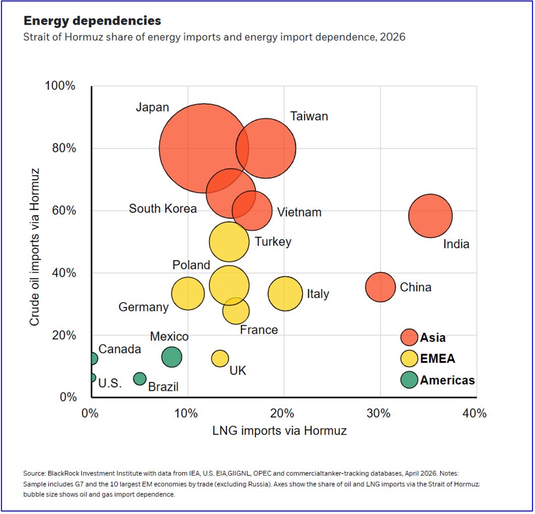 The Strait of Hormuz normally transports a fifth of the world’s oil and liquefied natural gas (LNG). Its de facto closure is having disparate effects across EM economies (see the chart below). Some, such as Asia and India, that rely on the strait for their energy needs are particularly exposed. By contrast, Latin American countries – many of which are net energy exporters – are far less exposed. That has helped EM stocks and bonds hold up overall.