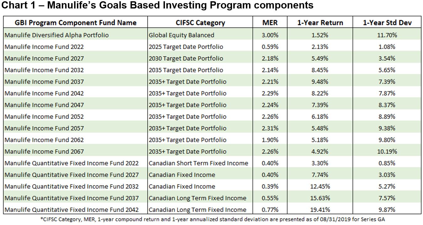 As seen in Chart 1, there are 16 mutual funds available for portfolio construction, which includes 10 target-date balanced funds, laddered in five-year increments from 2022 through 2067; five target date Canadian fixed-income funds, laddered in five-year increments from 2022 through 2042; and one tactical asset allocation portfolio.