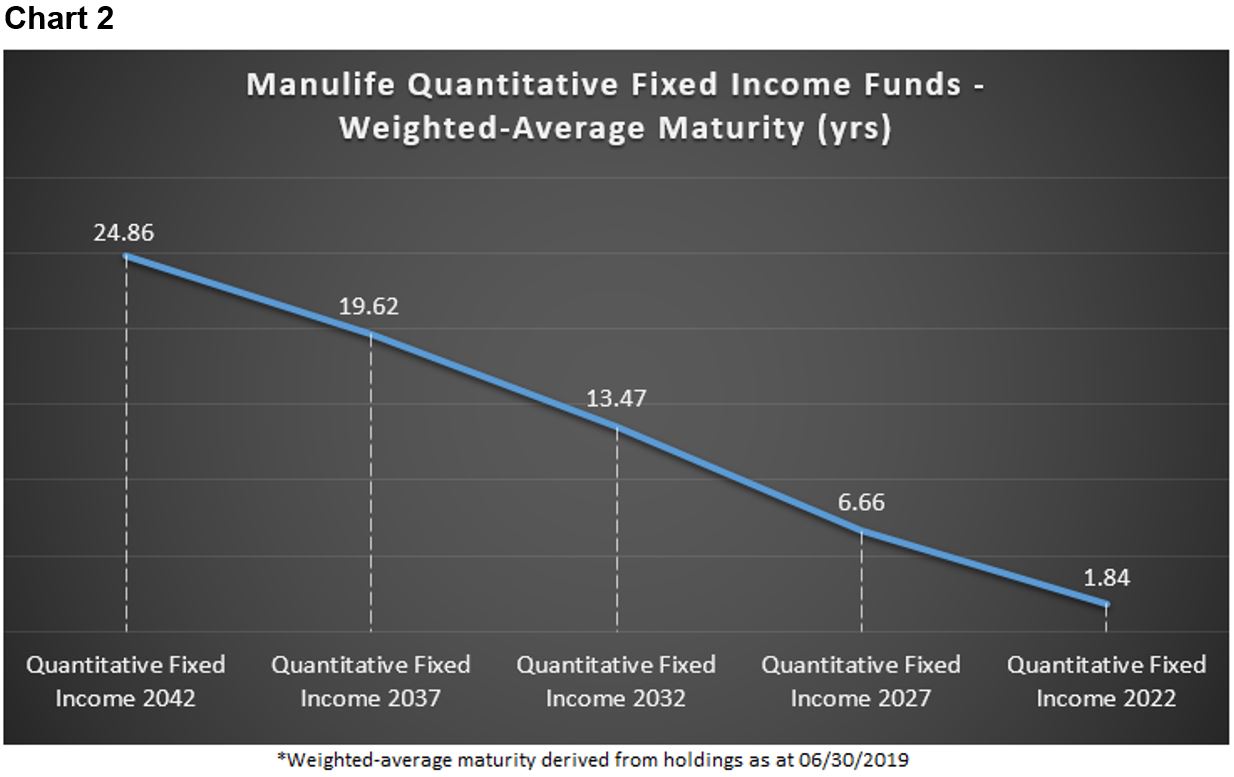 As you can see, weighted-average maturity decreases in a non-linear fashion, reducing slowly as it declines from 25 years in the Manulife Quantitative Fixed Income Fund 2042 before dropping to less than two years in the payout phase for Manulife Quantitative Fixed Income Fund 2022.
