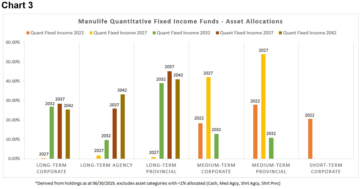 In addition to the shift in weighted-average maturity, “de-risking” across the funds’ asset types is also evident. Chart 3 shows how the five Quantitative Fixed Income funds scale in terms of bond allocations, including provincial, government agency, and corporate issues with maturities ranging from short (0-2 years) to medium (2-10 years) and long (10+ years).