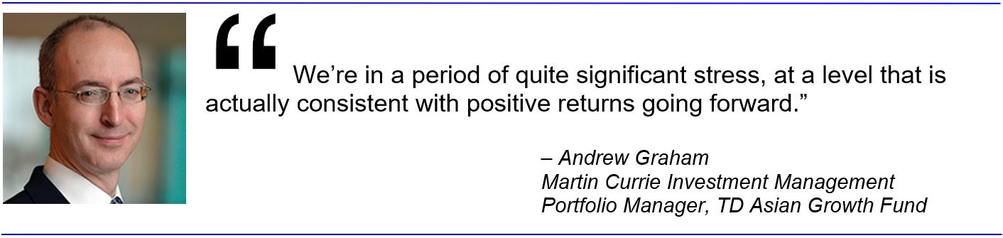 The natural inclination is to blame that downturn on the still continuing tariff tiff between China and the U.S., but Andrew Graham, head of Asia at Martin Currie Investment Management in Edinburgh, Scotland, and portfolio manager of the TD Asian Growth Fund, says there’s more to it than that. Given that he foresaw the downturn and took evasive actions, he probably has as good an insight as anyone into where it’s headed now.