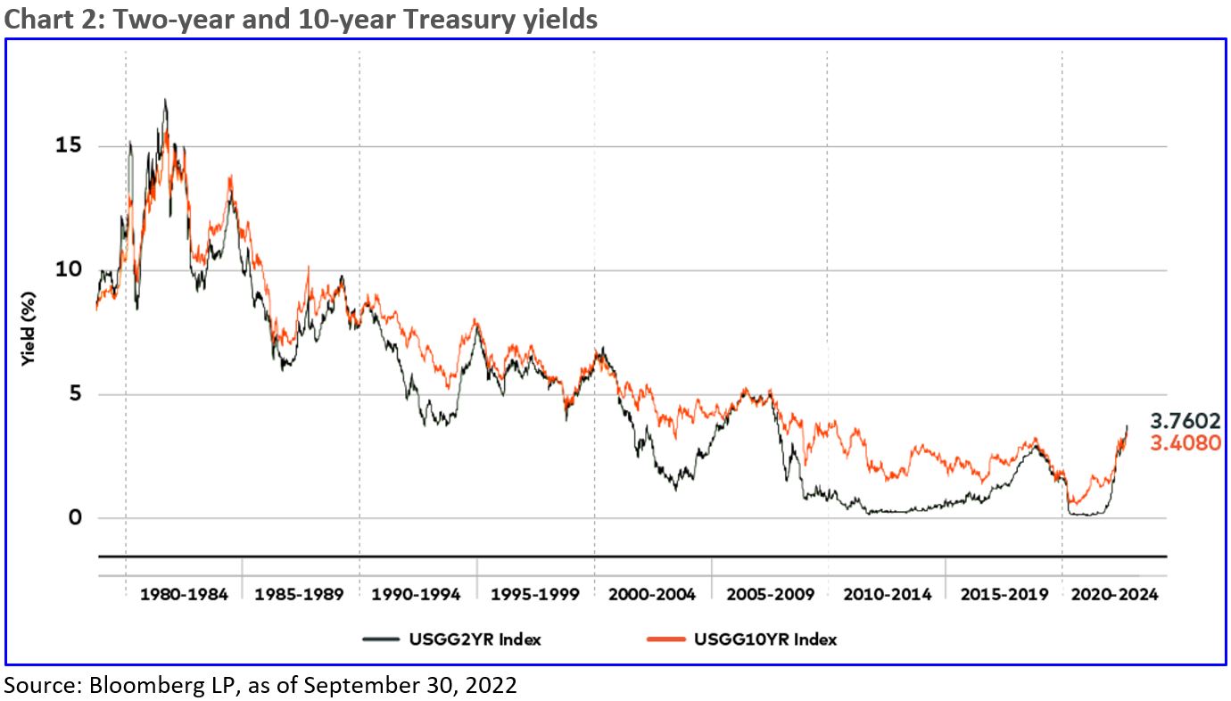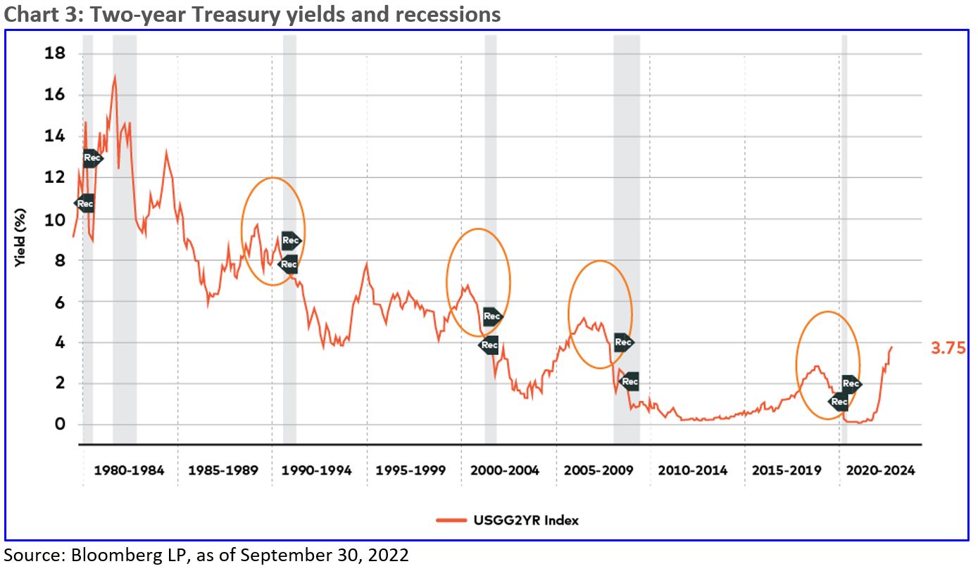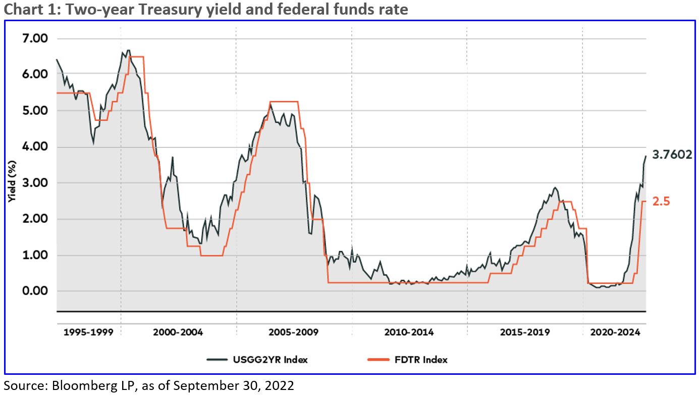 These are vital questions. They are also largely unanswerable – which won’t stop market prognosticators from making their best efforts, of course. But rather than guessing at answers amid so much uncertainty, we think investors would be on firmer ground if they made good decisions about where to look for answers. And in our view, there is a key indicator they absolutely must pay attention to: the two-year U.S. Treasury yield.