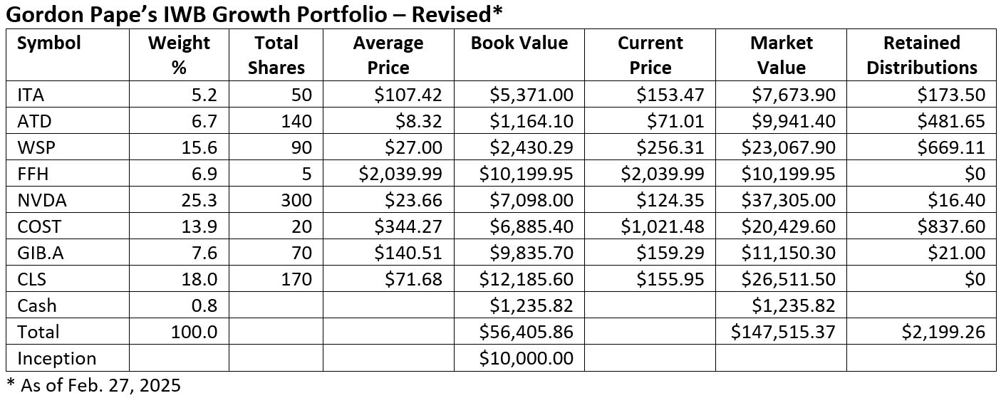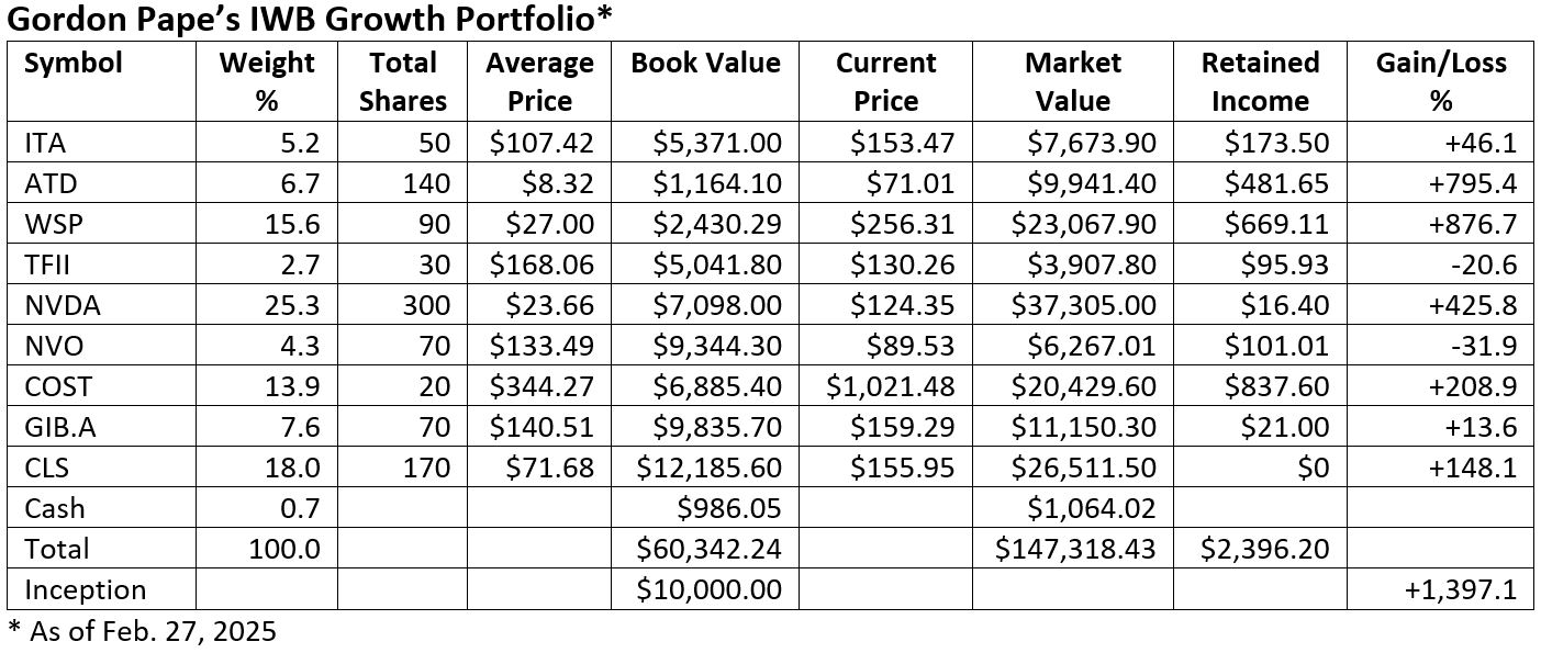 CGI Inc. (TSX: GIB.A). This is a Montreal-based international consultancy company that has been on our recommended list since August 2012. We added it to the Growth Portfolio in 2023 at $140.51. The shares were up $11.44 in the latest period. Last year, CGI initiated a quarterly dividend of $0.15 a share.