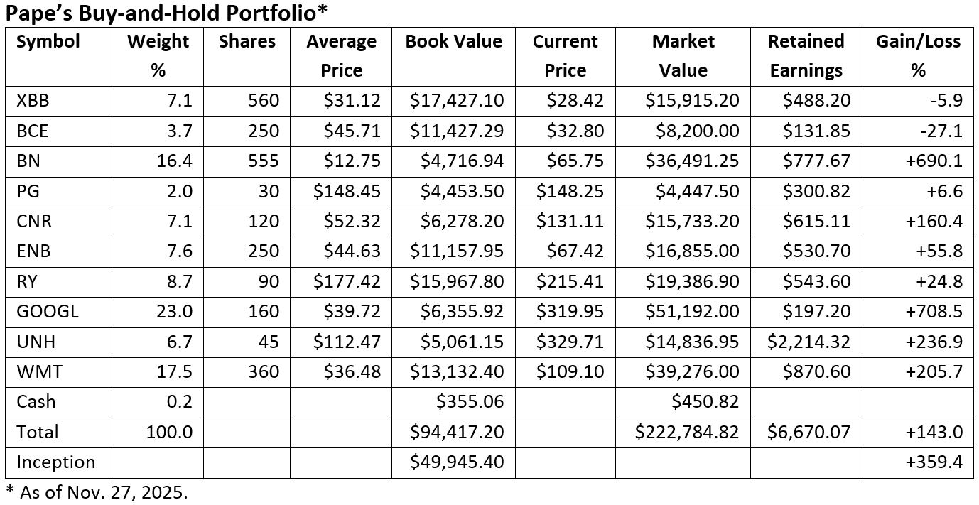 Here is the status of the portfolio as of Nov. 27. The Canadian and U.S. dollars are shown at par, but obviously the U.S. holdings are doing better thanks to the strength of the greenback. Trading commissions are not factored in, although in a buy-and-hold portfolio they are not significant.