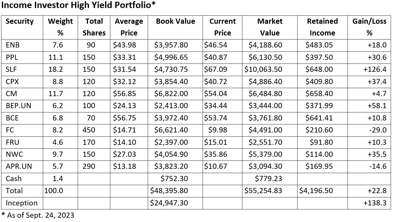 We are nearing an inflection point in the fight against inflation. The CPI report for August showed prices moving higher again, at 4%. That has raised fears that the Bank of Canada will resume raising rates again, perhaps as soon as its next meeting on Oct. 25. If that happens, it will put more pressure on the market price of the stocks in this portfolio.