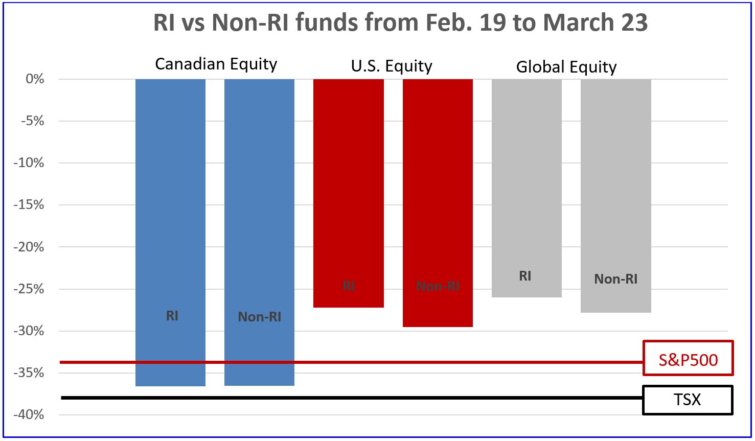 As can be seen, Canadian Equity RI funds lost 36.5% compared with the non-RI funds, which lost 36.6%, so there’s no real difference there. This is likely due to the fact that in terms of portfolio holdings, the difference between the RI funds and the non-RI funds in the Canadian Equity space is minimal; they hold many of the same stocks.