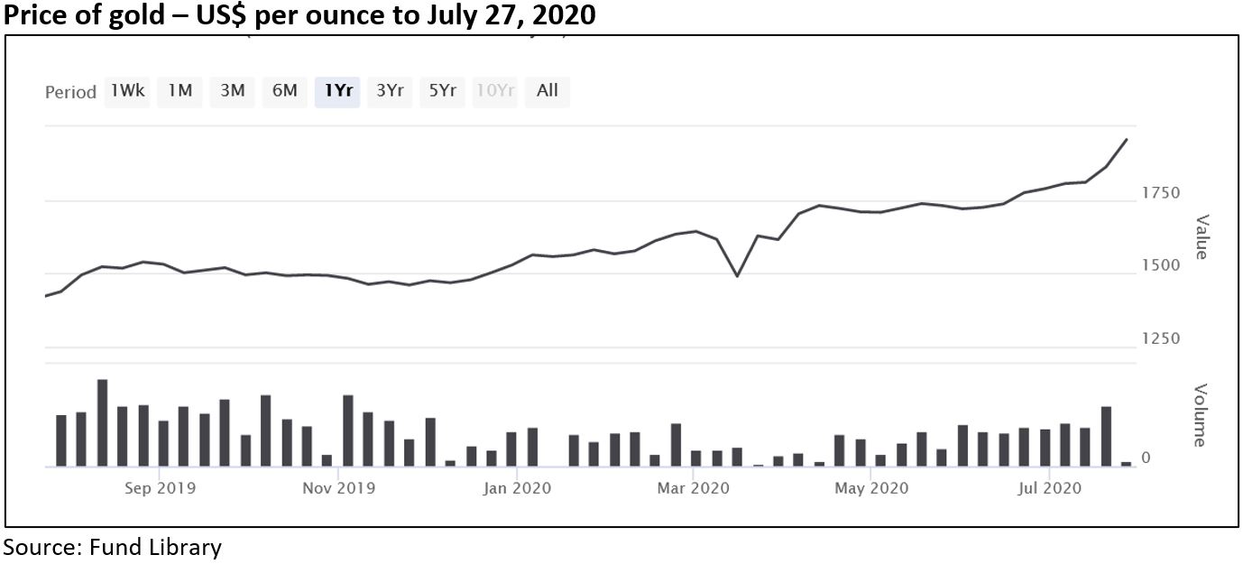 Gold has in recent weeks become more interesting to investors. After a lengthy period during which an ounce of gold traded around US$1,500 per ounce, it notched up slightly after the March stock market meltdown, to around US$1,700. Since the beginning of June, though, it has been climbing steadily, edging toward a historic high of US$2,000 per ounce in the final days of July.