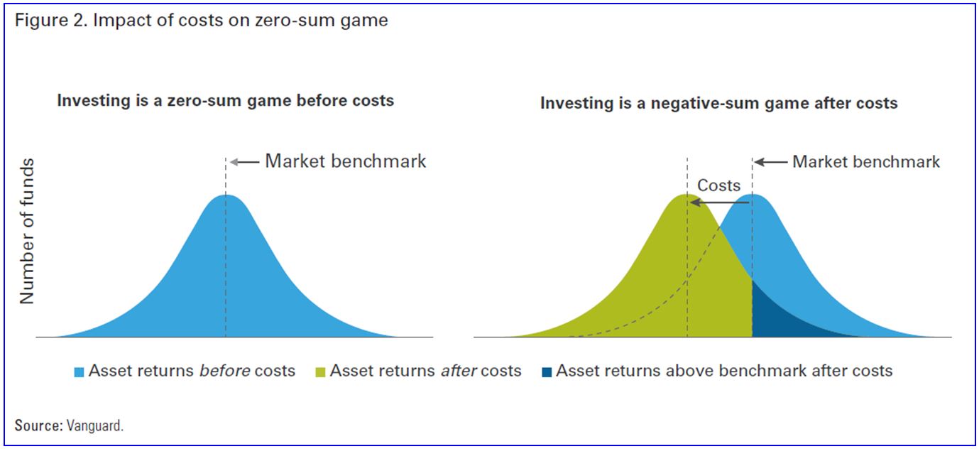 The reasoning behind this is rather straightforward. Passive investing tends to outperform its active counterpart on average because of the cost-matters hypothesis (Bogle, 2005), which states that “whether markets are efficient or inefficient, investors as a group must fall short of the market return by the amount of the costs they incur” (as shown in Figure 2).