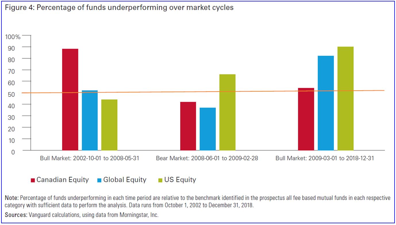 For example, in the global financial crisis (GFC), the average Canadian and global equity fund outperformed its benchmark, but that was not the case for US equities. Similarly, in the bull market from 2002 to 2008 leading up to GFC, the average US equity fund outperformed, while Canadian and global equity funds trailed.