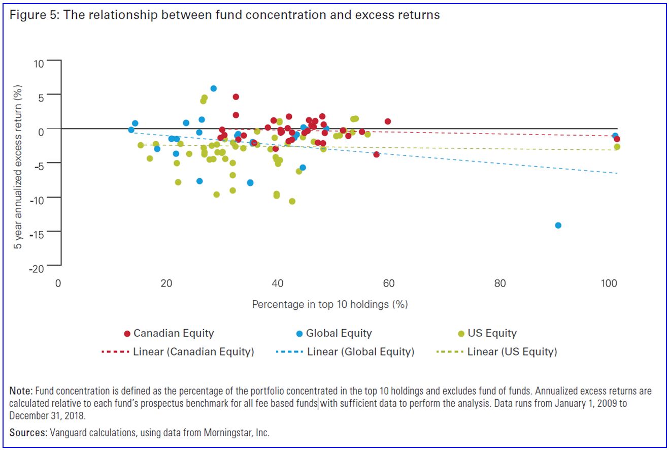 Some active managers claim that the more concentrated their portfolios are in the “best ideas,” the higher their returns and probability of outperforming the benchmark will be. The argument goes that the more diversified the portfolio becomes, the more diluted their best ideas are that can contribute to outperformance. However, regardless of how concentrated the portfolio is, markets are still a zero sum game and costs still create a headwind to outperformance.