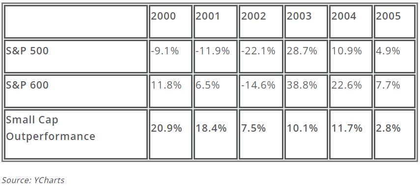While we don’t know when, we do believe the friend who ghosted us is getting ready to reach out and start another wonderful 5-10-year relationship. The historical relationship between large caps and small caps has moved to an extreme that dramatically favours the setup for small-cap for the next market cycle. This trend will be a friend to small-cap stocks again. The last time this happened was in the early 2000s following similar price appreciation and narrow concentration in a select few large-cap technology companies. The table below outlines the results we saw, with small caps going on an extended run compared to large caps, outperforming by an average of about 12% per year.