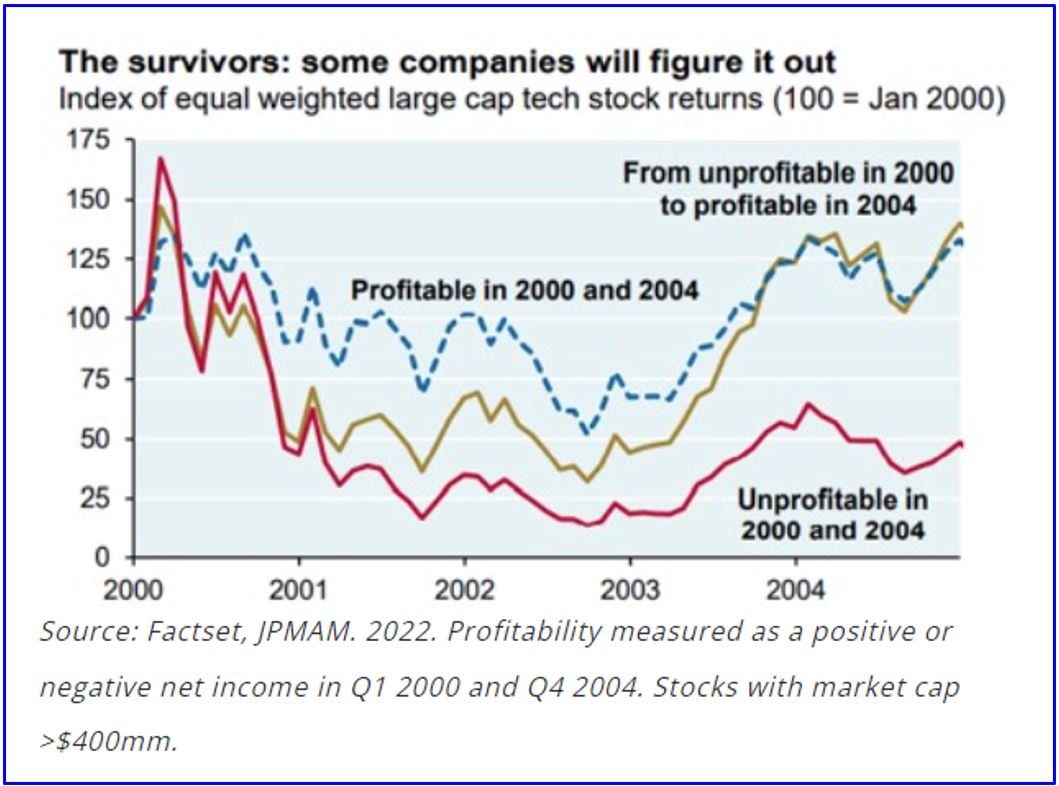 With small caps trading near trough valuations today, these companies are already priced for an uncertain environment ahead. The re-rating in valuation multiples we believe is a tailwind as risk appetite returns and new leadership emerges from strong companies. This is similar to early 2000-2005 period when companies that proved they can deliver profitable growth emerged as the long-term winners in small-cap technology. The following chart illustrates just that – with the yellow line showing companies that became profitable rebounding through 2003 and 2004 following an indiscriminate selloff in the early part of that decade.
