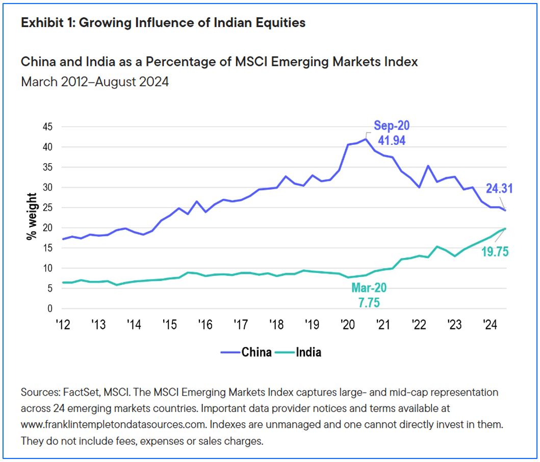 The recent MSCI Emerging Markets Index rebalancing is a substantial development for India’s equity markets, in our view. Global funds tracking these indexes will need to increase their allocation to Indian equities, which could lead to a surge in liquidity and positive price impacts. Since 2020, India’s weight in the MSCI Emerging Markets Index has doubled to nearly 20%, while China’s allocation has decreased to 24% from 42% (see Exhibit 1). This shift underscores India’s growing influence in the global investment landscape and could drive an estimated US$3 billion in capital inflows,1 likely benefiting underrepresented sectors.
