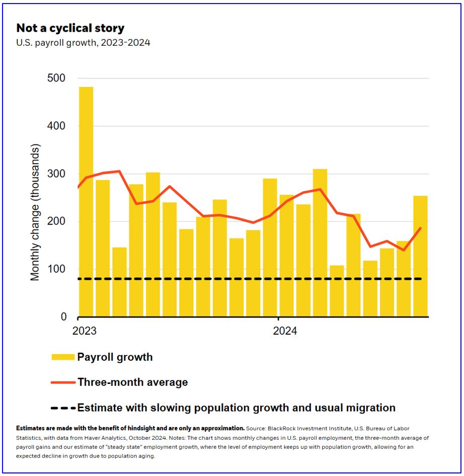 Employment growth is still robust, last Friday’s job data confirmed (see the chart below). The unemployment rate has fallen again, and markets have somewhat scaled back Federal Reserve rate cut expectations. Wage growth has cooled, bringing down inflation. Yet that might not last: Immigration will likely fall to its historical level – and no longer offset the decline in the workforce from population aging. That could push up inflation again.