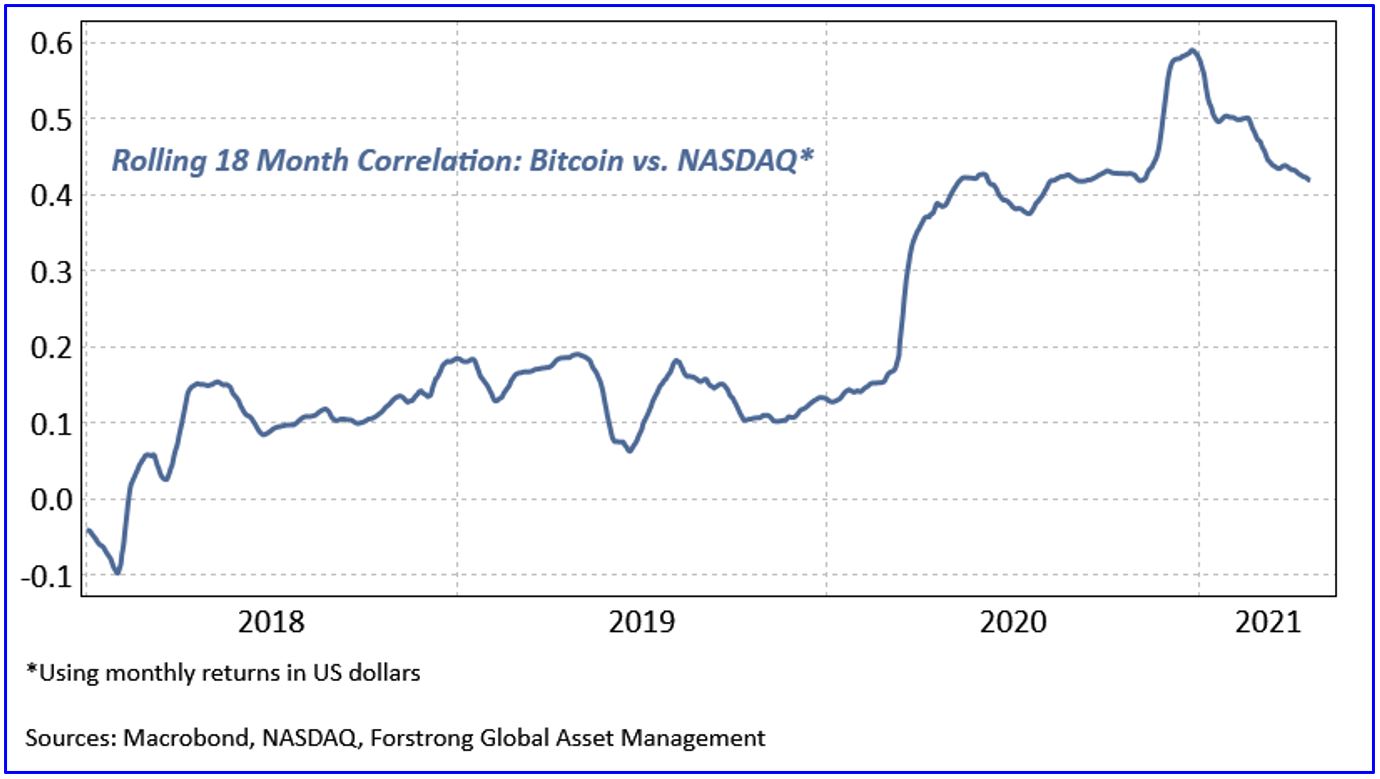 Dogecoin aside, if crypto generally is more of an object of speculation rather than a market hedge, then its prices should increasingly correlate with the overall levels of speculation in the marketplace. This is exactly what has happened. All of Bitcoin’s major losses have coincided with market declines – in 2012, 2015, and 2018. Even more worrying is that crypto correlations with the Nasdaq (a proxy for risk appetite and generally a similar pool of investors) have moved steadily higher over the last few years. Investors should not expect crypto to hedge the next bear market.