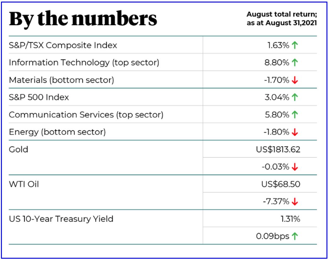 By the numbers displays total returns for the month of August 2021. The content of this document is for informational purposes only, and is not being provided in the context of an offering of any securities described herein, nor is it a recommendation or solicitation to buy, hold or sell any security. The information is not investment advice, nor is it tailored to the needs or circumstances of any investor. Information contained in this document is not, and under no circumstances is it to be construed as, an offering memorandum, prospectus, advertisement or public offering of securities. No securities commission or similar regulatory authority has reviewed this document and any representation to the contrary is an offence. Information contained in this document is believed to be accurate and reliable, however, we cannot guarantee that it is complete or current at all times. The information provided is subject to change without notice.