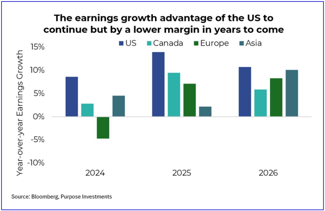 Is the S&P expensive at 21.8 times estimated earnings for the next 12 months? And is Canada cheap at 15.3 times? It is not just what you pay for current earnings but how they will grow over time. The S&P has been more expensive for years and has outperformed, mainly because it has enjoyed strong earnings growth. In 2024, U.S. headline earnings were just under 10%; this rises next year. Canada has pretty low growth in 2024, with some better growth next year. Europe and Asia are cheaper than the U.S. and a bit cheaper than Canada, with less earnings growth over the coming years. All these projections sort of make sense.
