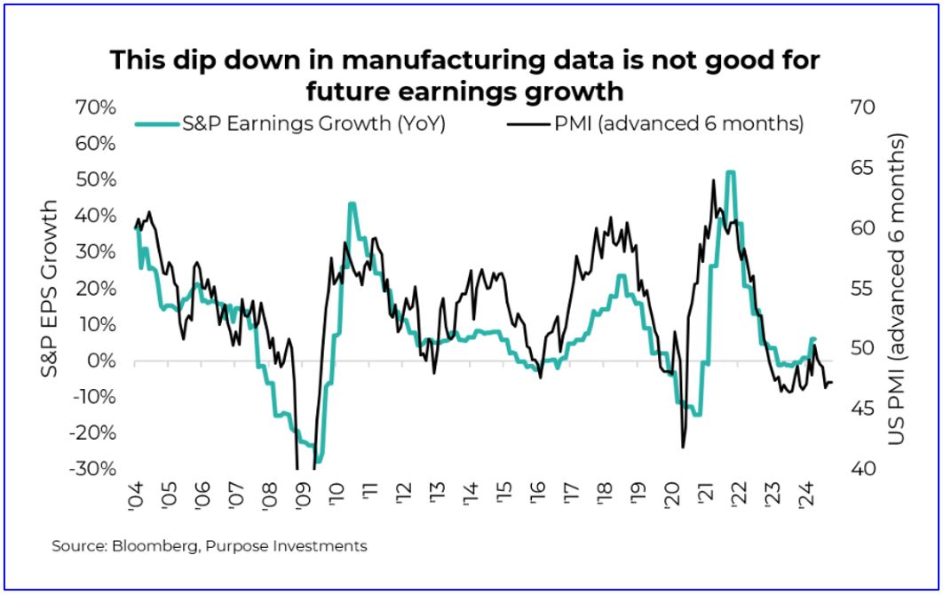 While the overall economy may drive earnings growth, manufacturing economic activity does have an outsized weighting for S&P 500 earnings. This may pose a problem. A strong relationship exists between the monthly survey of manufacturing activity (PMI) and earnings growth six months into the future, showing a 0.7 correlation. During the past couple of months, we have seen a drop in the PMI manufacturing survey, which may imply a softening of the pace of earnings growth. Directionally, this is a pretty strong relationship, so it may be a challenge for the S&P to post increasing earnings growth into 2025, as current consensus estimates would imply with manufacturing activity slowing.