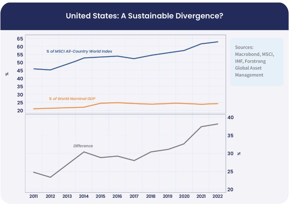 Yet there is a glaring dynamic in today’s market positioning. Investors, still enamoured with the narrow leadership of the last decade, continue to “buy the dip” in U.S. growth and tech stocks and, mind-bogglingly to us, government bonds in the West. The real issue is that most investors remain anchored to the secular stagnation period after 2008. In other words, most simply do not believe we can ever escape low interest rates. And so, the world capital of hot money remains in the perceived safest country – the U.S., a region where a decade-long tear in the 2010s has led to lofty valuations and a swollen share of global stock market capitalization of over 60%, from a low of 45% (and, a level far above its roughly 25% of global GDP).