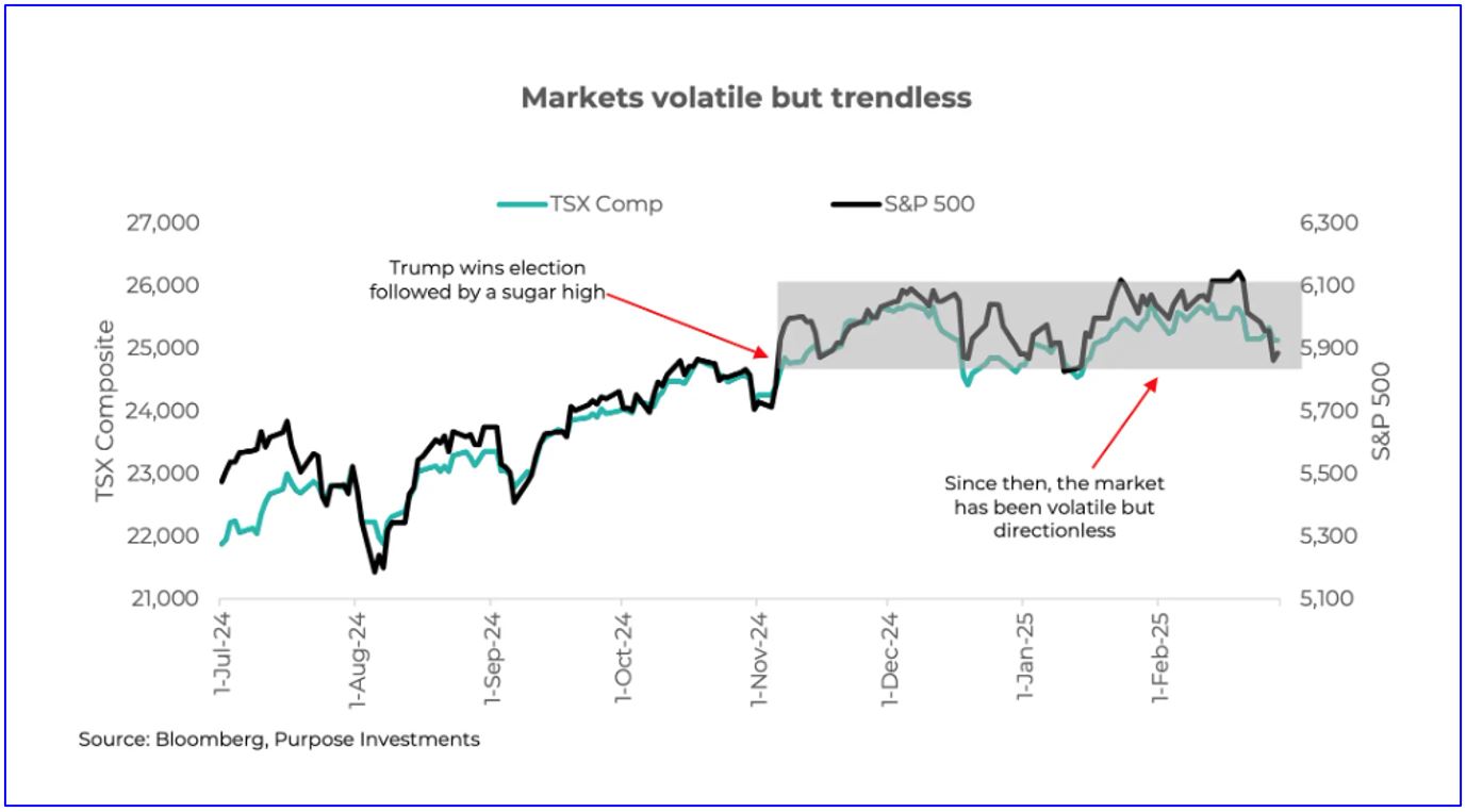 Following Trump’s election win, the markets rejoiced, partly fuelled by the unwinding of market hedges and the anticipation of more market-friendly policies from the new administration. Unfortunately, as with any “sugar high,” it just didn’t last. Since cooling in December, the S&P 500 has been stuck in a range around 6,000-6,100. This is an impressive feat, in our opinion, given the avalanche of policy announcements and talk. Sure, it has caused markets to bounce around much more, but they’re still within this range. Even the TSX, clearly more at risk of an escalating tariff conflict, has been within one good trading session of its all-time high. The word “resilient” is fitting.