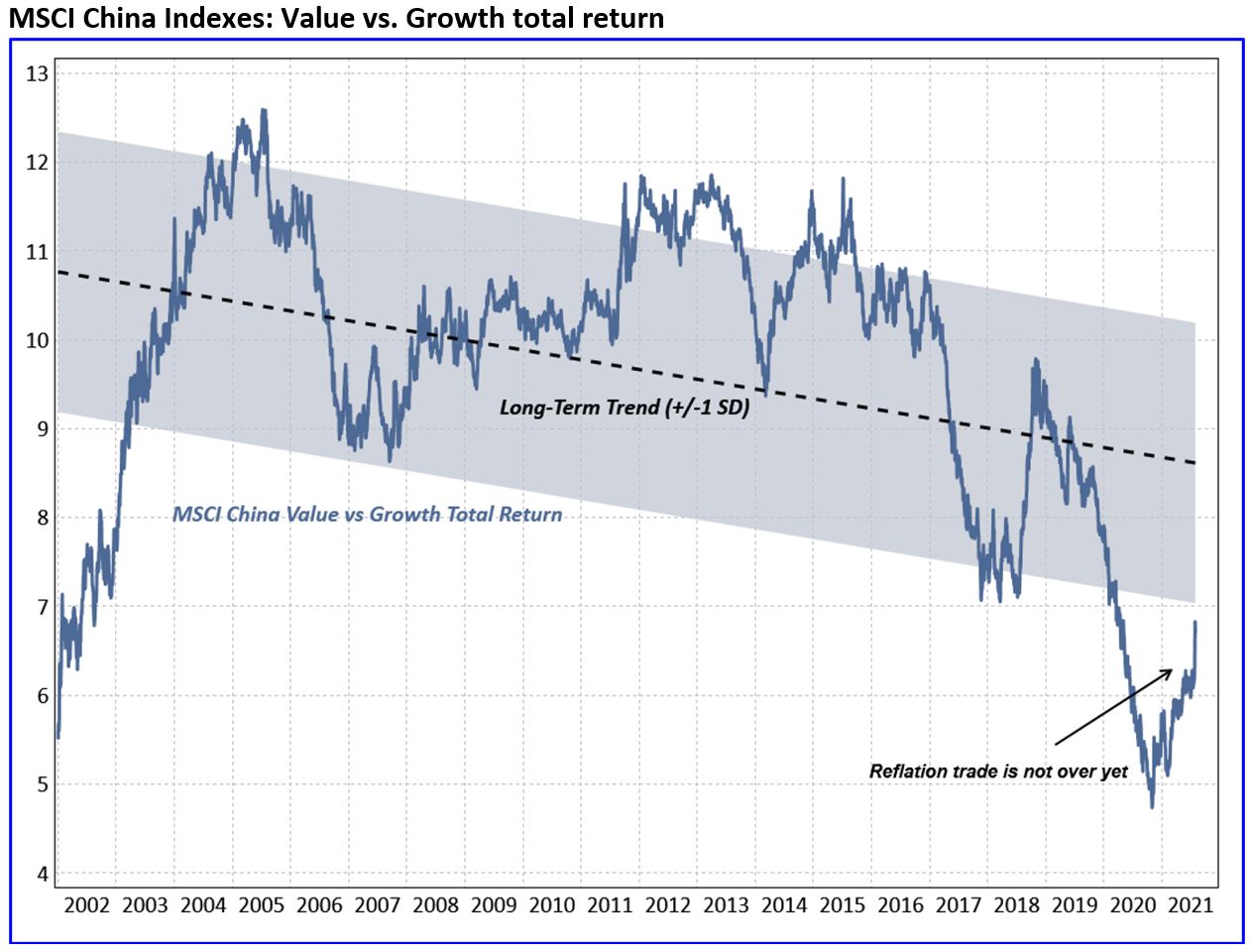 But what to make of the current selloff in China? Many of China’s Big Tech stocks have declined more than 50% from their highs earlier this year. A tactical bounce from here is highly likely. Yet the tech sector remains richly valued, as it does across most of the world. However, the rout has also led to indiscriminate liquidation across all sectors (most of which are not in the crosshairs of China’s regulatory crackdown). China’s value index, tilted toward financials and consumer discretionary sectors, trades on low earnings multiples and is primed to benefit from China’s emerging reflationary efforts and new credit cycle. Chinese regulators are also adopting a far more constructive tone, aiming to restore confidence in domestic capital markets. Investors should start to accumulate positions here.