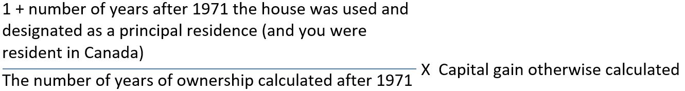 Despite only allowing one property to be claimed, the rules allow you to have two residences in the same year, i.e., where one residence is sold and another is purchased in the same year. That is why the above formula adds “1” to the number of years the property was a principal residence (the “plus one rule”). Note: As a result of certain changes to the rules that were announced in 2016, the “plus one” rule will not apply where an individual is not resident in Canada during that year. Prior to the change in rules, you could benefit from the PRE for the year that you purchased a residence in Canada, even though you were not a Canadian resident in the year of acquisition.