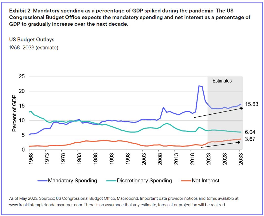 Over most of the past 15 years, very low interest rates kept the amount of interest paid to service the stock of national debt in check. Just prior to the pandemic, for instance, annual gross federal government outlays to pay interest on the national debt were about US$500 billion. Just three years later, courtesy of much higher indebtedness and rising interest rates, that figure has nearly doubled to US$930 billion.5 According to U.S. Treasury estimates, the cost of servicing U.S. federal government debt accounts for 13% of total federal government outlays in 2023.6