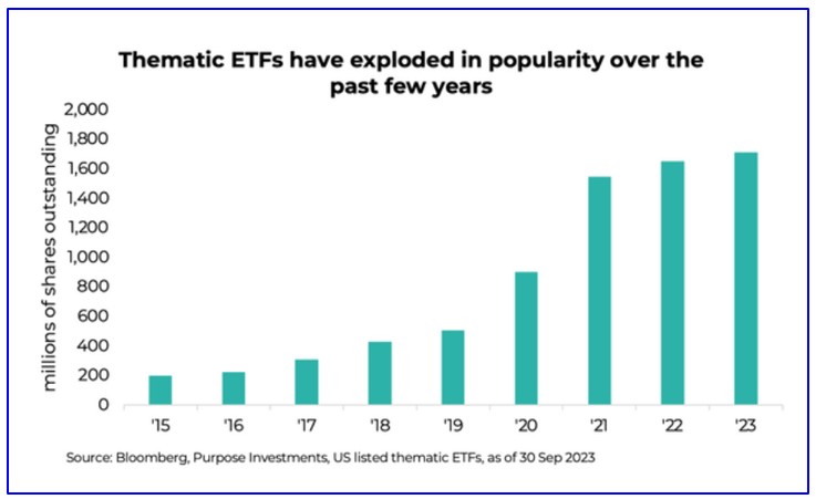 The essence of thematic-focused investing is, at its core, a really good idea. There is no denying that the world changes over time, and often there are long-term tectonic shifts. In years past, we have all witnessed the rise of smartphones, or the rise of cloud computing, and healthcare spending due to advances in solutions and aging populations. Identifying these trends isn’t that difficult as they become increasingly evident as society evolves and behaviours change demand patterns.
