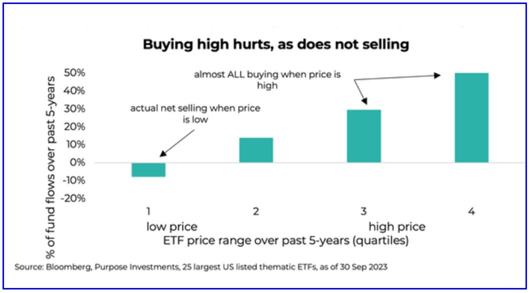 Contributing to the previous evidence of poor timing is an apparent lack of sell discipline. Even thematic ETFs that have seen their share price fall 40%, 50%, or even 80% over the past few years have seen very few sell. One of the largest thematic ETFs in the U.S. is down 75% since early 2021 and still has about the same number of shares outstanding. Congrats on being a stable investor and sticking with your conviction. Unfortunately, you are now poorer.