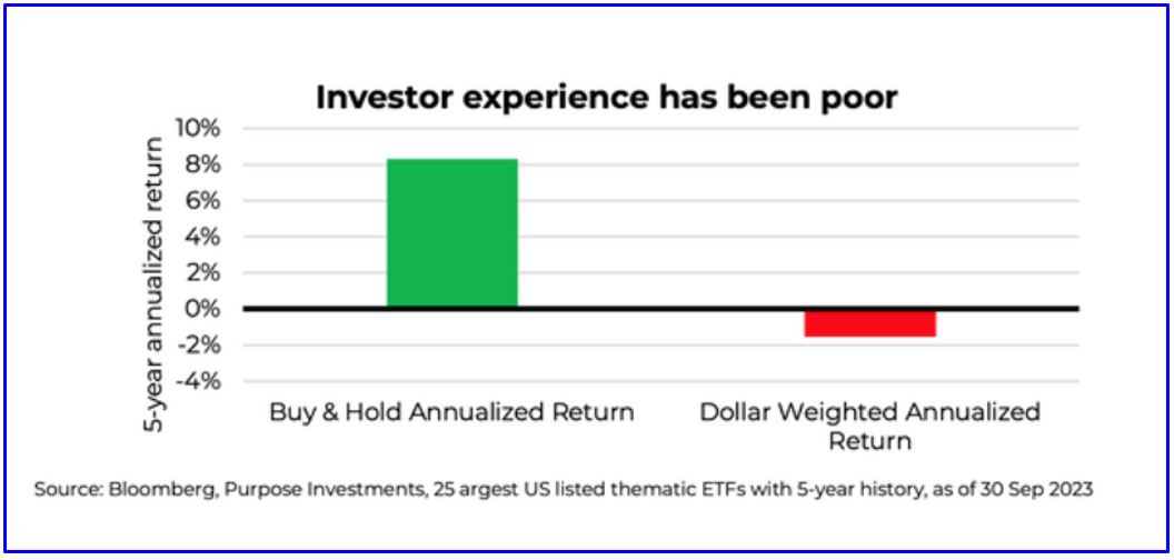 Thematic ETFs can offer a growth boost for portfolios. Plus, given the composition of the TSX and its lack of growth (lots of dividends, not as much growth), many Canadian investor portfolios are light on the growth factor. There are many options available, covering many different themes, from many different ETF providers that could actually experience a positive tailwind for many years. But the data clearly point out that picking a theme or two or five and jumping on board is not the best path.