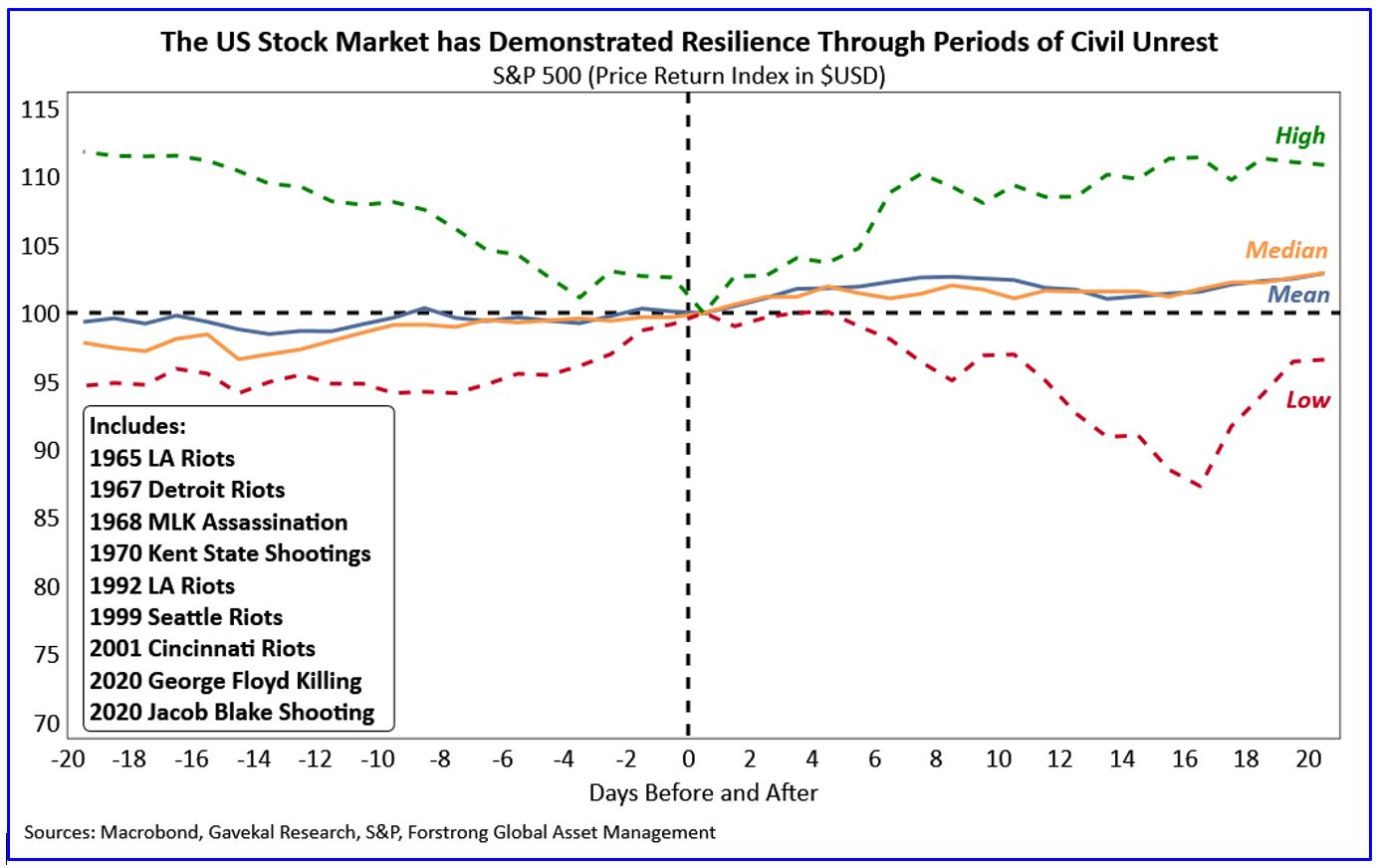 And while there is risk that a contested result will trigger protests, a long series of precedents suggest any civil unrest will have little or no effect on financial markets. Stock markets shrugged off nationwide protests following the 1968 assassination of civil rights leader Martin Luther King, the 1965 and 1992 Los Angeles riots, and most recently, the unrest that has swept U.S. cities since the death of George Floyd in late May.