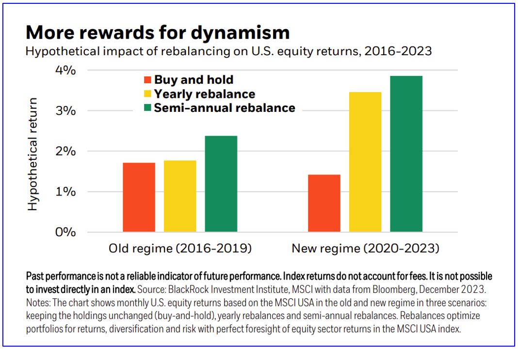 The test: Imagine you could perfectly predict future U.S. equity sector returns and adjust your portfolio to capture them. That would have had little upside in the four years before the pandemic. “Buy-and-hold” strategies (the orange bar on the left-hand chart below) would have generated similar returns to portfolios allocating to outperforming sectors more frequently (the left yellow and green bars). The reward has been much greater since the pandemic, with rebalancing delivering more than double the hypothetical returns of a buy-and-hold strategy. See the gap between the orange bar and the others on the right-hand chart.