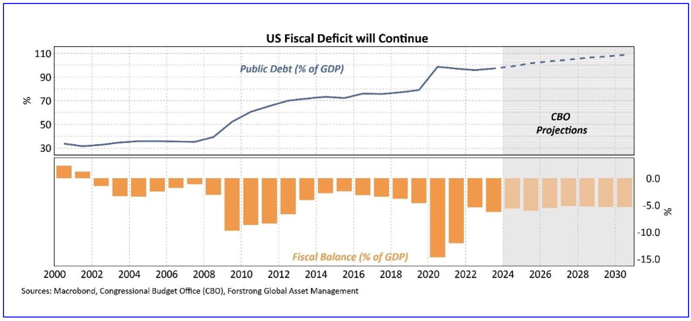 Finally, and most importantly, will fiscal policy change? The beneficiaries and relative size of federal largesse will change if the color of the administration changes (our investment team is actively mapping out different scenarios and sectors that will thrive under each presidential candidate). But whether Republican or Democrat, the U.S. government is clearly committed to running massive budget deficits as far as the eye can see. This is the new normal. Notably, both parties support extending most of Trump’s 2017 tax cuts – a move the Congressional Budget Office estimates would add around 20%, or $4.6 trillion, to the deficit over the next decade.