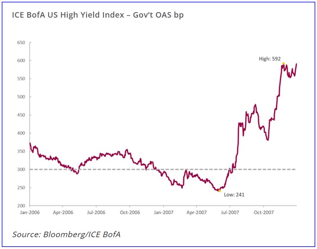 With the past year seeing the highest sustained government bond yields since before the Global Financial Crisis of 2008, it is entirely possible that spreads break through 300bp OAS in high yield for the first time since 2007.