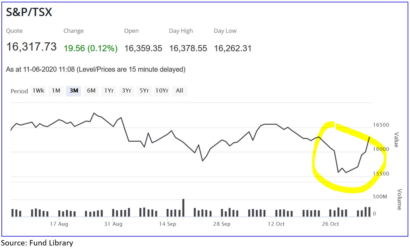 October is a typically volatile month for markets, and this year has been no exception. The main North American stock indexes were down for the month across the board. So were crude oil and gold. We heard media talking heads bringing out all the old saws about how markets “hate uncertainty,” or “it’s the U.S. election,” or “it’s Covid-19.” And while it’s true some or all of these things may have contributed to stock market volatility, no single item could be said to predominate. And then on the first trading day of November, a strange thing happened. Stock markets turned around and began rallying, and they continued rallying through this first week of November, producing strong gains (see the accompanying graph).