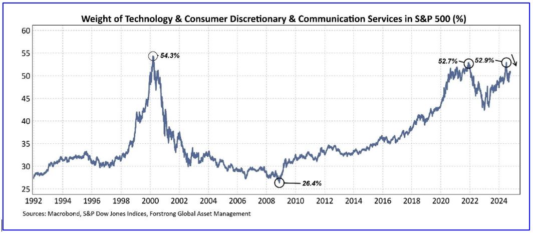 Since 2010, the S&P 500 has delivered nearly 600% in total returns, driven largely by robust U.S. earnings and the outperformance of tech stocks. These top tech companies, responsible for nearly half of the S&P 500’s returns since 2010, are now trading at 30 times their expected earnings for the next year, fueled by excitement over artificial intelligence (AI). Most asset allocators are now fully mesmerized by mega-cap American tech companies and firmly committed to a structural overweight.