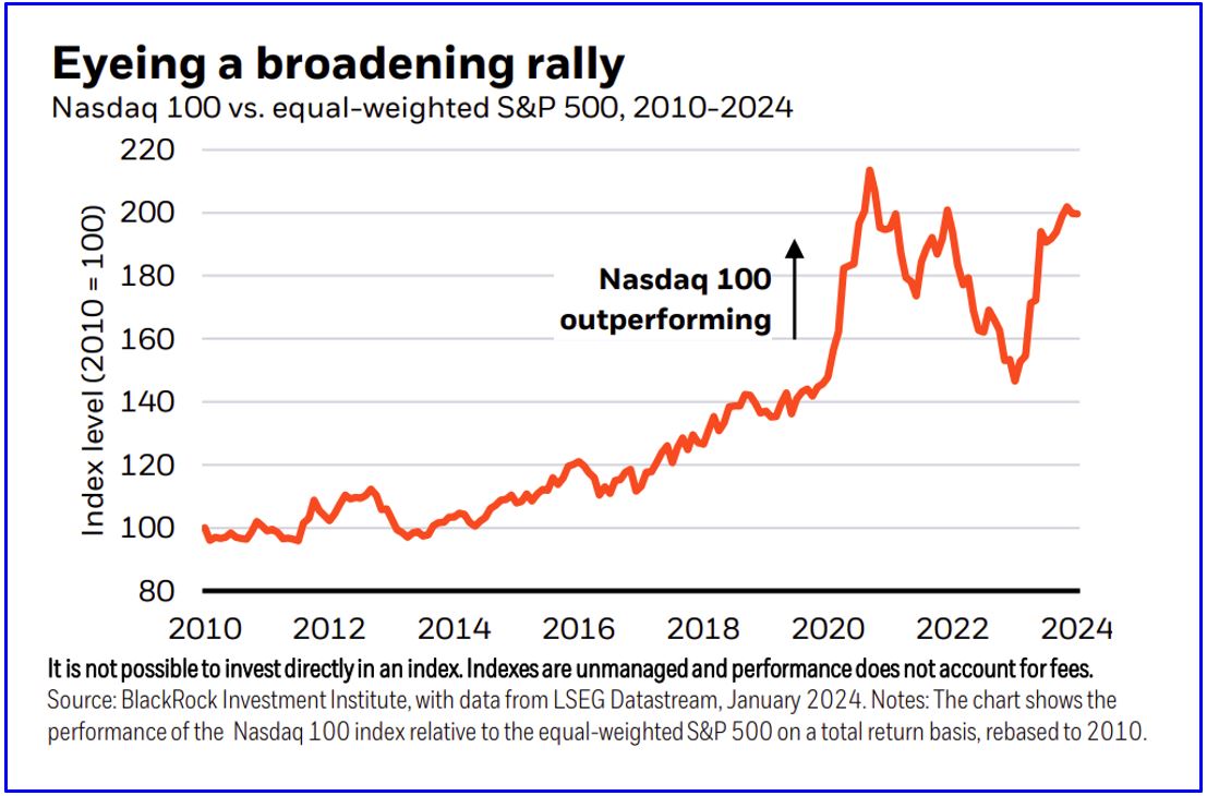 In mid-2023, we shifted how we present our tactical views to capture opportunities from mega forces, or big structural forces. Our overall U.S. equity view was neutral – consisting of an underweight at the benchmark level and an overweight to the AI theme. That selectivity has been rewarded in the past 12 months, with tech pushing U.S. stocks to all-time highs. The Nasdaq 100 surged 50% in that time, while the equal-weighted S&P 500 rose 4% in what’s been a narrow rally (see the chart).