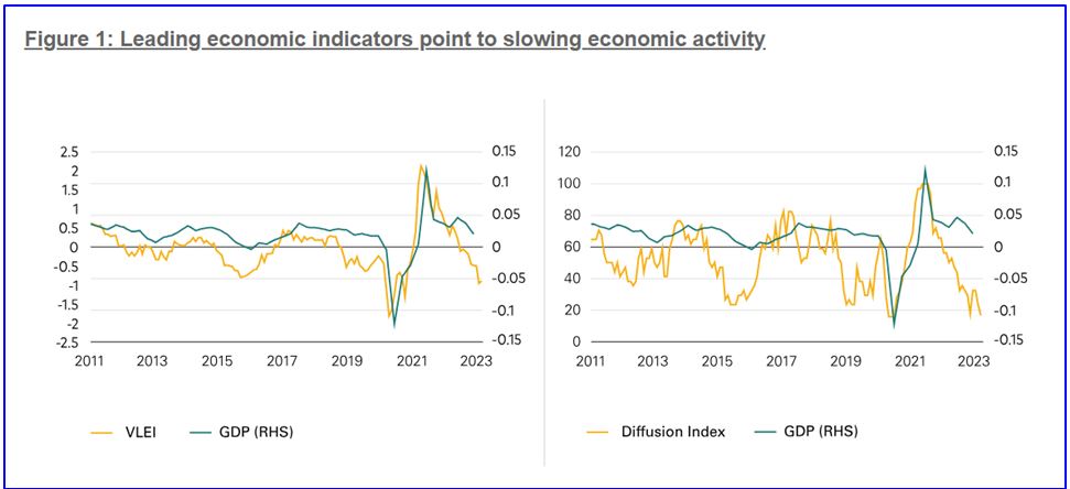 We continue to foresee 2023 GDP growth of around 1% in Canada, with risks to the downside, and a mild recession late in the year. Leading indicators1 for economic activity, as shown in Figure 1, have continued to deteriorate, which has caused us to lower our overall growth expectations. Real GDP was largely unchanged in the fourth quarter of 2022 compared with the third, i.e., a 0% growth during the quarter, driven by higher interest rates and its knock-on effects on consumption and spending. The Bank of Canada projects the GDP growth to be 1.4% in 2023 and 1.3% in 2024. However, it is expected to reach 2.5% in 2025 as the economy adjusts to higher interest rates and inflation returns to the 2% target, in the interim.