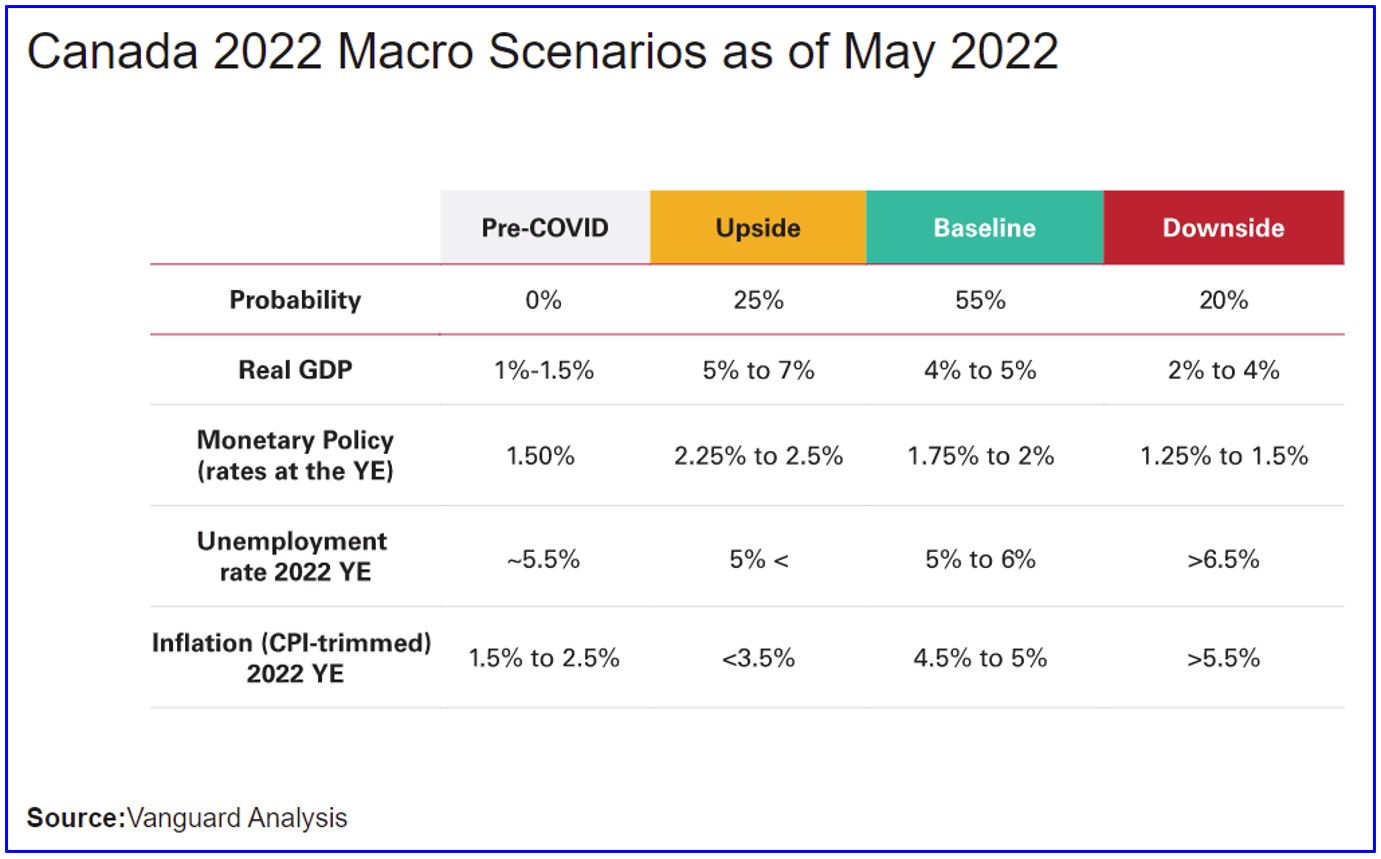 Vanguard models suggest the pace of growth may have slowed in Canada in the first quarter. The government is scheduled to release first-quarter GDP data on Tuesday, May 31. In our base case, we foresee economic growth around 4%-5% for full-year 2022. Real GDP grew by 1.6% in the fourth quarter compared with the third, and by 4.6% for all of 2021. Vanguard is closely watching interest rates, inflation, and housing prices for clues about Canada’s economy. We expect more interest-rate hikes to raise mortgage rates further, which in turn could curb fast-rising housing prices that have fueled the growth.