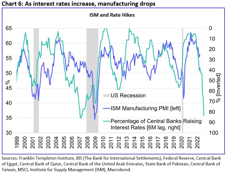 But manufacturing is typically vulnerable to higher interest rates. And as Chart 6 shows, the future for manufacturers will be challenged by the large numbers of central banks now hiking rates.