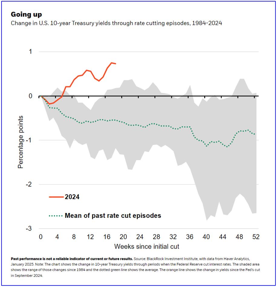We look through near-term noise but outline triggers for adjusting our views, by either dialing down risk or shifting our preferences. First, we’re tracking the impacts of global policy – especially U.S. trade, fiscal, and regulatory policy. Second, we gauge whether risk appetite will stay upbeat as earnings results for AI beneficiaries come in and given high tech valuations. Third, vulnerabilities like a sudden jump in bond yields could also shift our view. The unusual yield jump since the Fed started cutting rates underscores this is a very different environment. See the chart below.